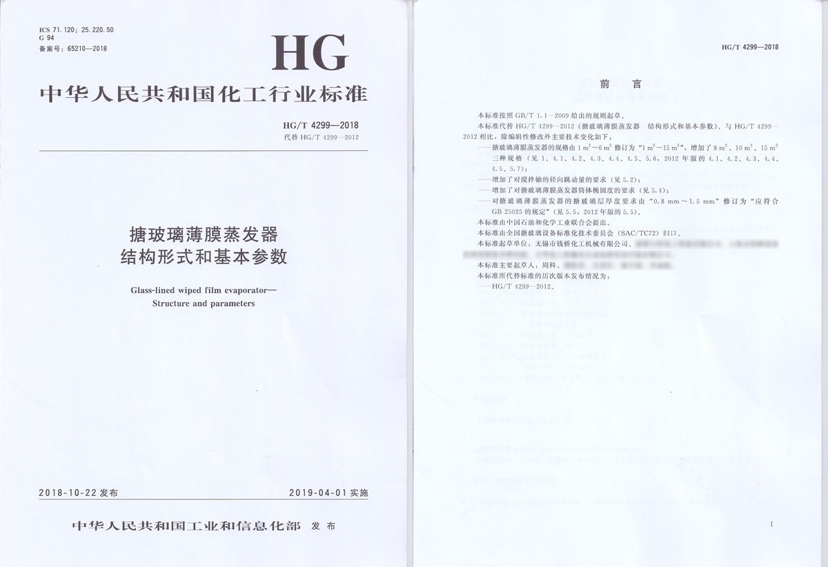 無錫錢橋化工機械有限公司參與起草中華人民共和國化工行業標準HG/T 4299-2018《搪玻璃薄膜蒸發器結構形式和基本參數》。