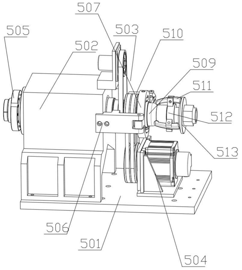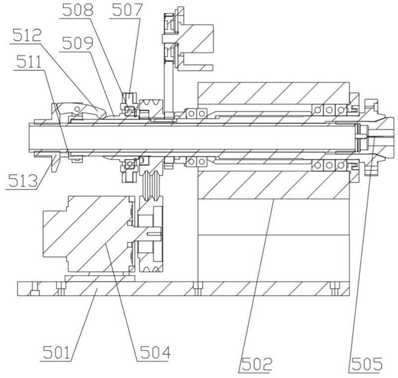 在一些實(shí)施方式中,第一夾持部包括第四安裝板、主軸箱、附加夾頭和旋轉(zhuǎn)驅(qū)動件,主軸箱設(shè)置在第四安裝板上,主軸箱遠(yuǎn)離卡盤的一側(cè)設(shè)有附加夾頭,旋轉(zhuǎn)驅(qū)動件驅(qū)動主軸箱。