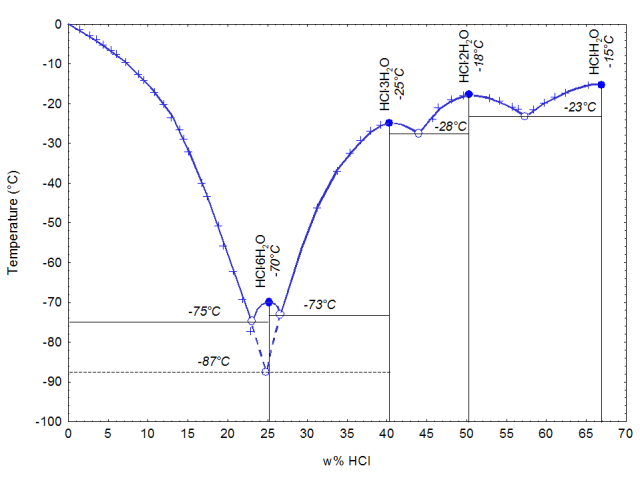 如下圖所示,鹽酸共有四個結(jié)晶的共熔點(diǎn),分別對應(yīng)四種晶體:68%(HCl的質(zhì)量分?jǐn)?shù),下同)時的HCl·H2O、51%時的HCl·2H2O、41%時的HCl·3H2O和25%時的HCl·6H2O。另外在24.8%時還有一種亞穩(wěn)的HCl·3H2O生成。