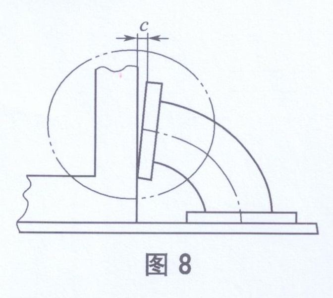 將被測管件(彎頭)法蘭一端放置在平臺上,緊貼另一端法蘭面處放專用直角尺(如圖8所示),長邊比管件(彎頭)法蘭外徑最高處稍長,用塞尺量取法蘭外徑最高處與直角尺長邊的最大距離c,此值即為管件(彎頭)法蘭對(另一側)法蘭的垂直度。