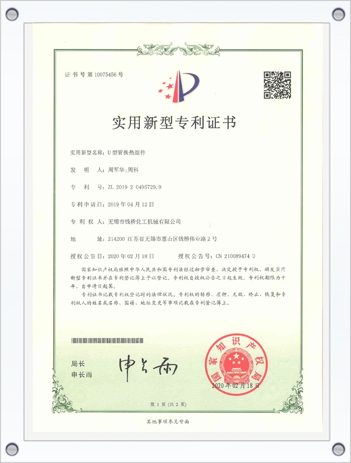 U型管換熱組件專利證書