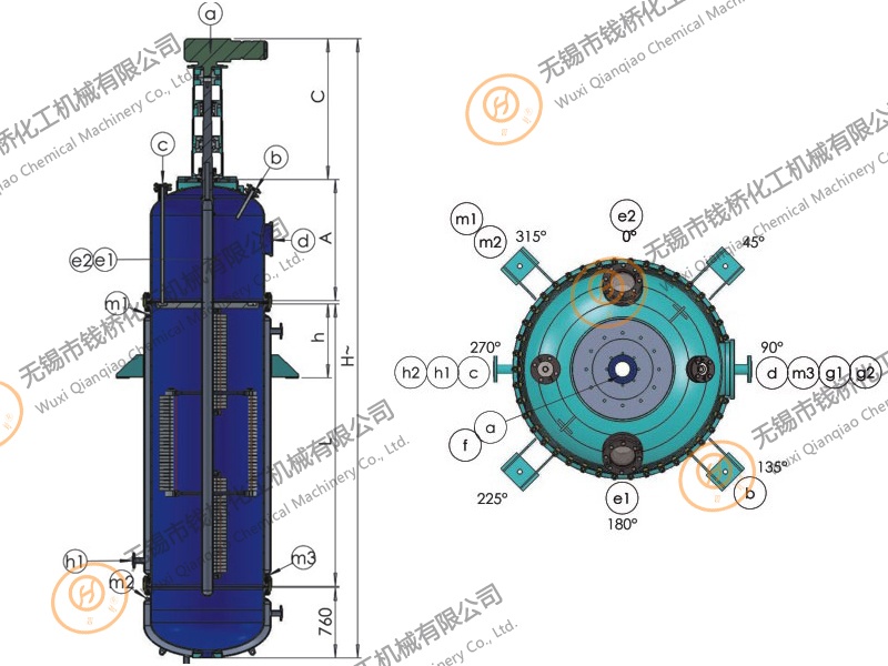 WFE系列搪玻璃薄膜蒸發(fā)器:設計壓力:罐內FV-0.25MPa,夾套0.6MPa;執(zhí)行標準:(HG/T4299-2019)。